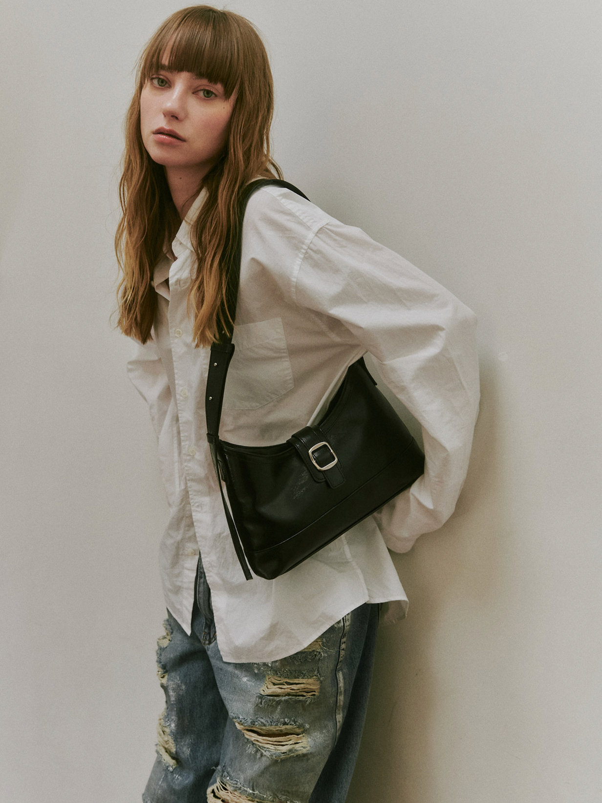 マットなシルバーのバックル金具がポイントです。